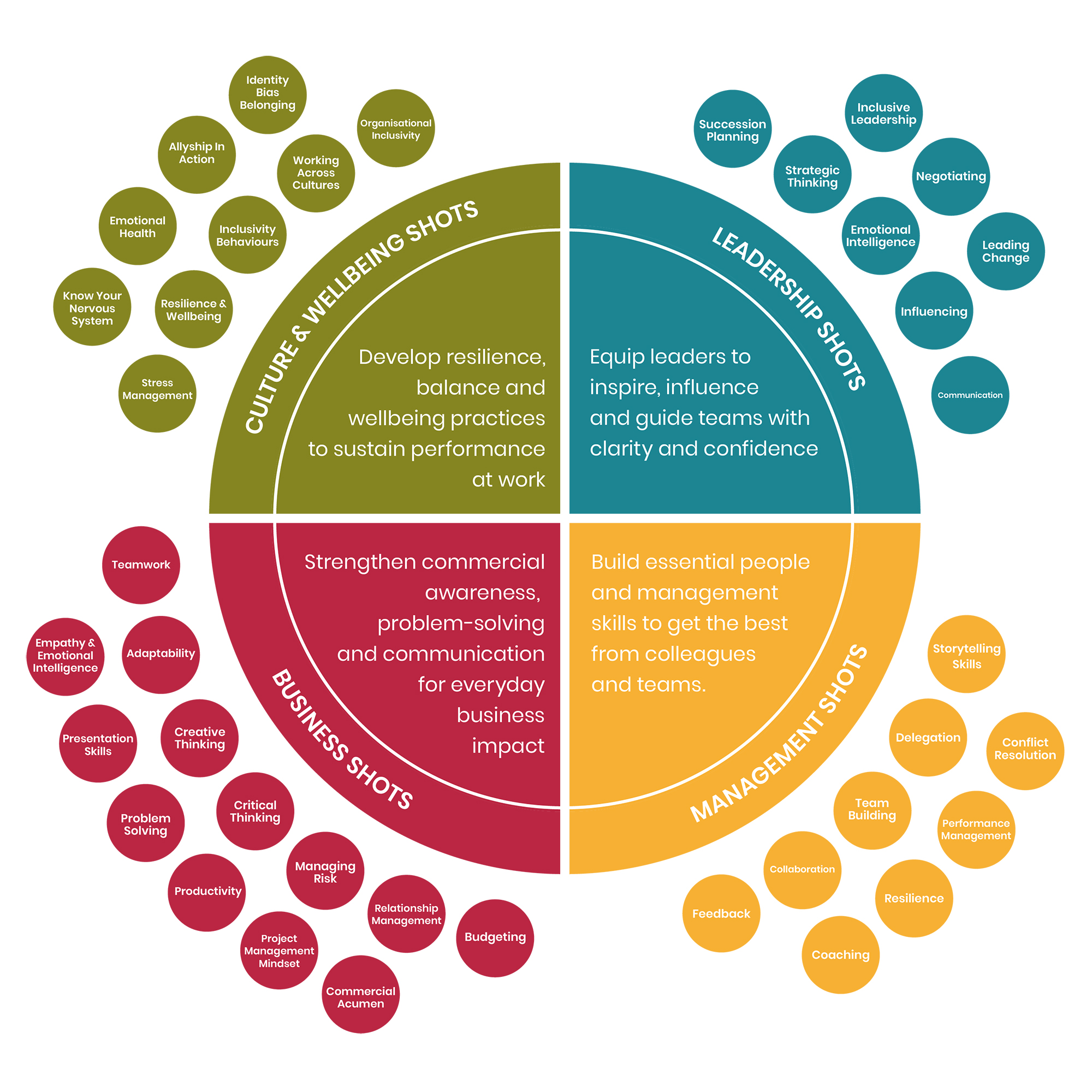 With Tarigo Skill Shots, you’re in control. Choose from 30 different shots across Leadership, Management, Business, and Wellbeing skills to build a programme that fits your team’s exact needs. Every shot stands alone, so you can tailor the mix to your priorities.